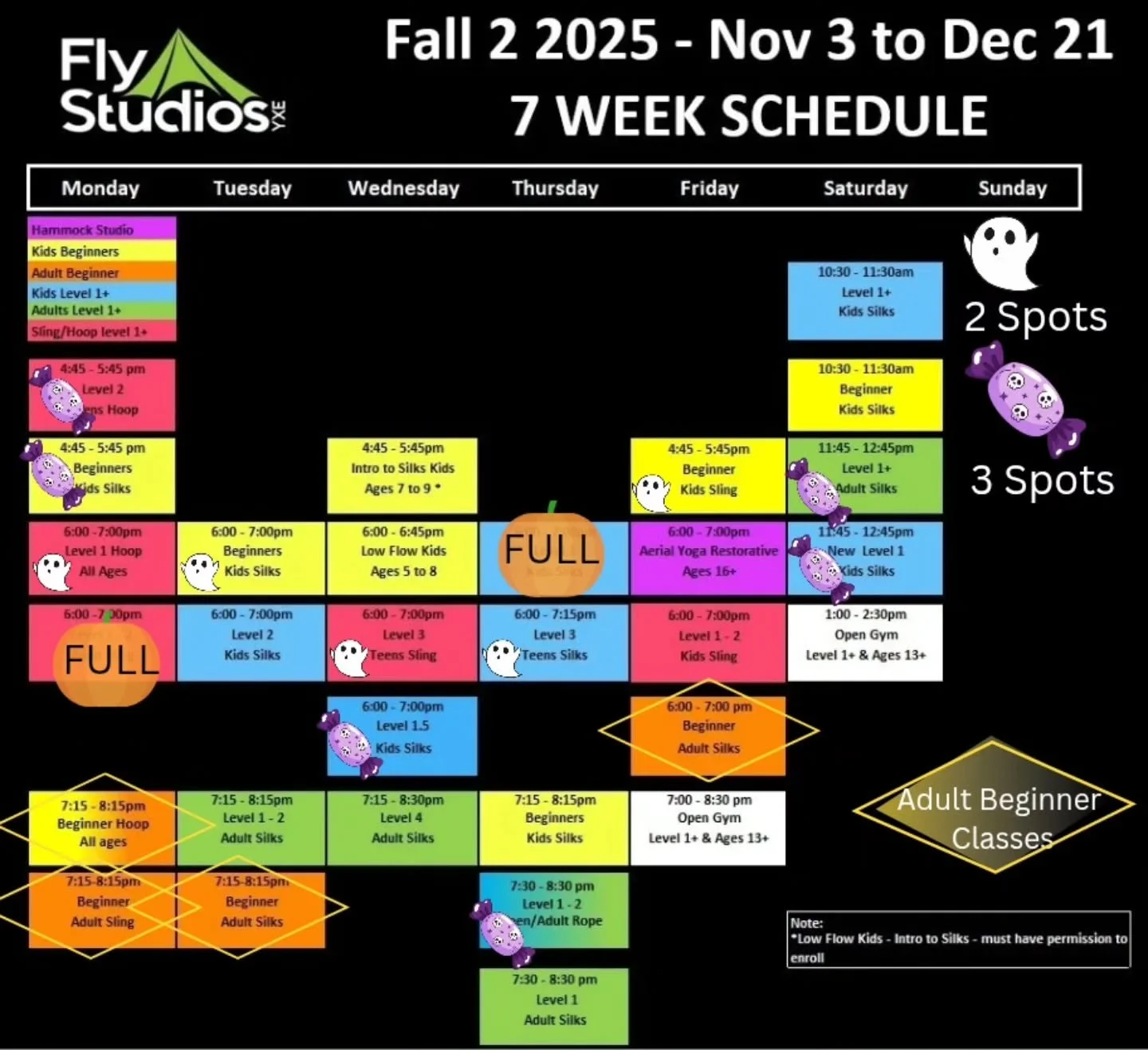 Beginner to Level 3 class sessions available. Check with your teacher or contact us at the studio (admin@flystudiosyxe.com) to figure out what class to register for if unsure.